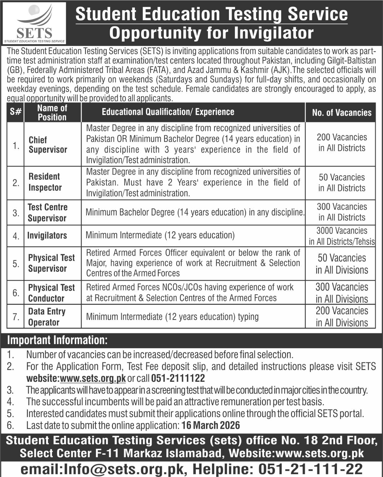 SETS Job For Opportunity Examination staff 2026