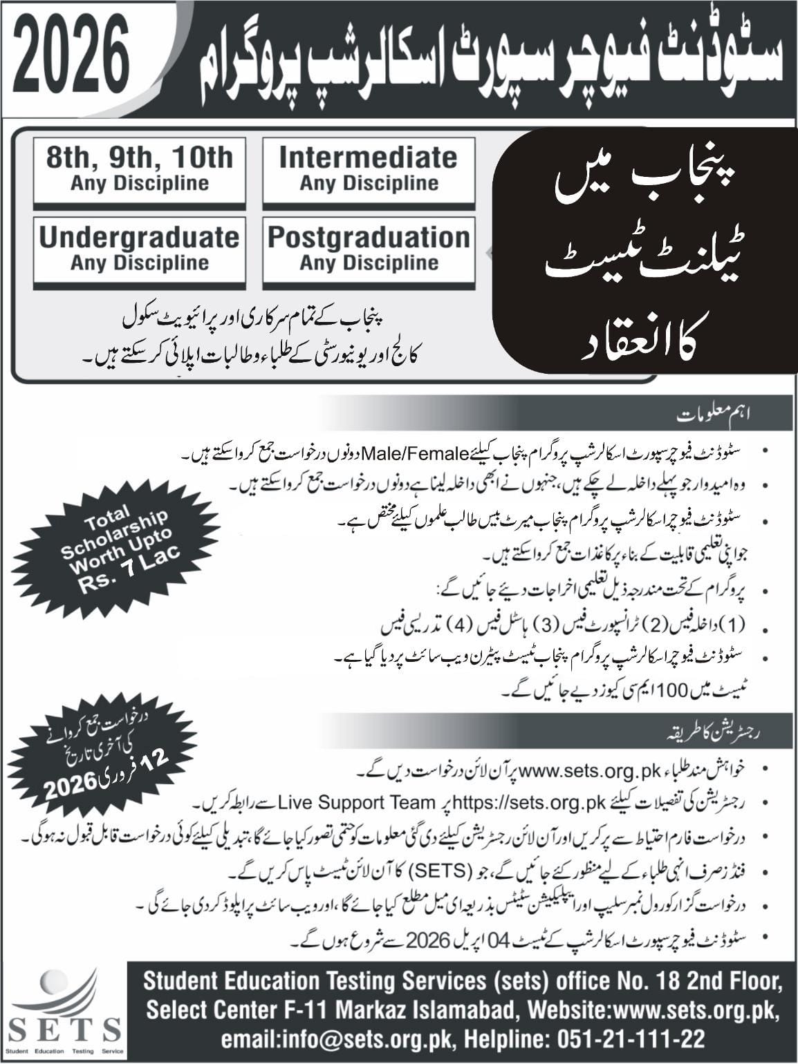 Date has been extend for SETS Job For Opportunity Examination staff 2026 | SETS Job For Opportunity Examination staff 2026 | Student Future Support Scholarship Program Punjab 2026 | CHECK YOUR SETS RESULTS | Office Timings: 10:00 AM to 02:00 PM (Monday to Friday) | Dear Applicants You Enter Your Valid (E-mail) Id, Get Any update Message Will be received on Email | Dear Applicant Enter your valid number (which is not converted from one network to another ) so that SMS delivery is ensured. |